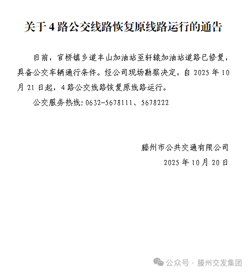 關(guān)于4路公交線路恢復(fù)原線路運(yùn)行的通告