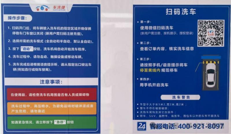 服務安全規(guī)范,全程保障無憂。為保障洗車過程順利與安全,公司在洗車區(qū)域醒目位置張貼了清晰的操作指南與注意事項,明確車輛尺寸要求、規(guī)范操作流程及應急處理方式。同時,推出24小時客服熱線,隨時為車主提供操作指導、咨詢與故障響應支持。設備運行期間,公司也將安排專職人員定期進行設備巡檢與維護,確保系統(tǒng)持續(xù)穩(wěn)定運行,持續(xù)提供高品質服務。