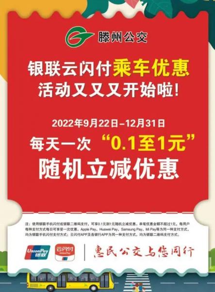 2022年9月22日起至2022年12月31日。使用銀聯(lián)手機閃付(包括Apple Pay,Huawei Pay,Samsung Pay,Mi Pay等)、云閃付APP二維碼支付、各銀行APP二維碼支付。每用戶每種支付方式每天享受一次“0.1至1元”隨機立減優(yōu)惠。