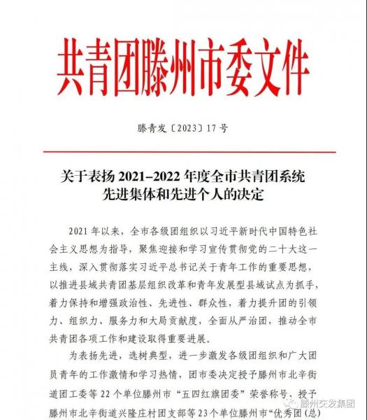 6月26日,共青團市委下發(fā)了《關(guān)于表揚2021-2022年度全市共青團系統(tǒng)先進集體和先進個人的決定》(滕青發(fā)〔2023〕17 號),滕州市交通發(fā)展集團有限公司團委榮獲2021-2022年度滕州市五四紅旗團(工)委榮譽稱號。同時,集團張鐸同志,榮獲2021-2022 年度滕州市“志愿服務(wù)先進個人”。