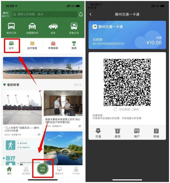 點擊APP首頁“云卡”或“掃碼乘車”,云公交卡支持實名制開通云公交卡,進(jìn)入頁面后,點擊開通乘車碼服務(wù),進(jìn)入錢包界面進(jìn)行充值,支持微信,支付寶,銀行卡方式充值。充值后顯示乘車二維碼,把乘車碼貼近公交車刷卡車載機(jī)感應(yīng)區(qū)掃碼乘車即可。