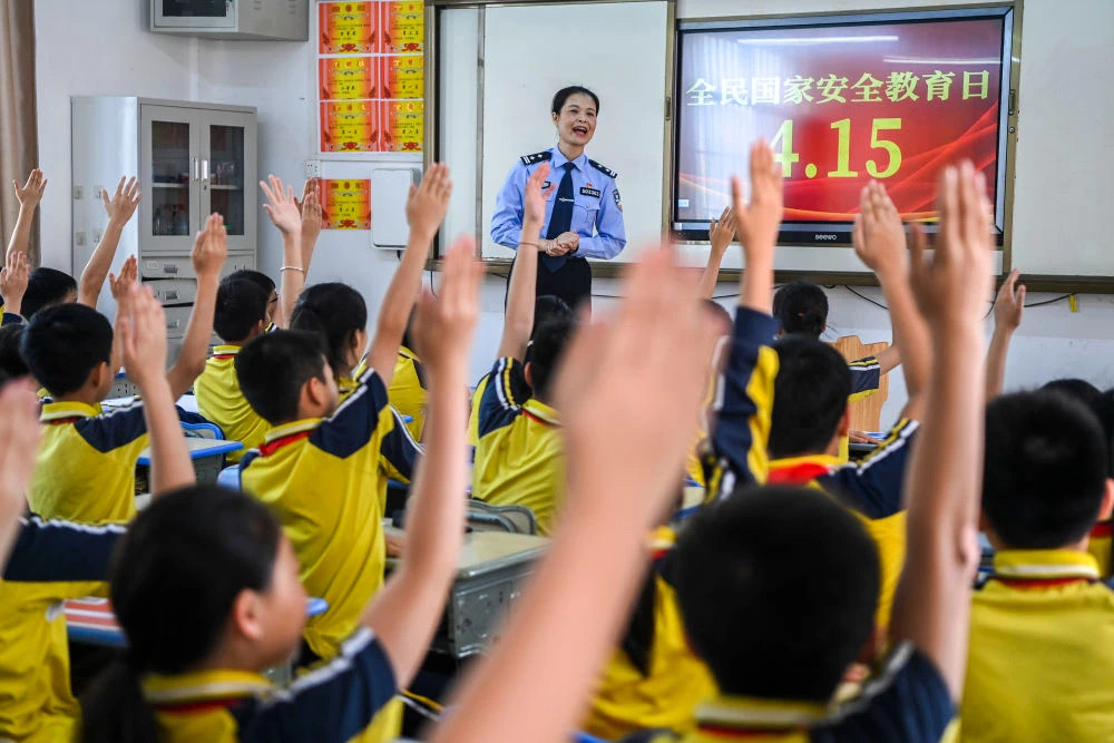 2024年4月15日,在廣西興業(yè)縣一所小學(xué)內(nèi),公安民警在講解國家安全相關(guān)知識的過程中與學(xué)生們互動。新華社記者 曹祎銘 攝