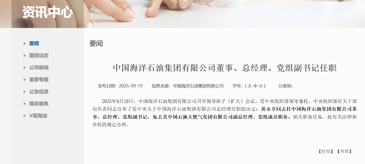 9月19日,中國海洋石油集團有限公司(以下簡稱“中海油集團”)官網(wǎng)發(fā)布消息稱,在當日集團舉行的領(lǐng)導班子(擴大)會議上,黃永章被任命為任集團董事、總經(jīng)理、黨組副書記,同時免去其中國石油天然氣集團有限公司(以下簡稱“中石油集團”)副總經(jīng)理、黨組成員職務。